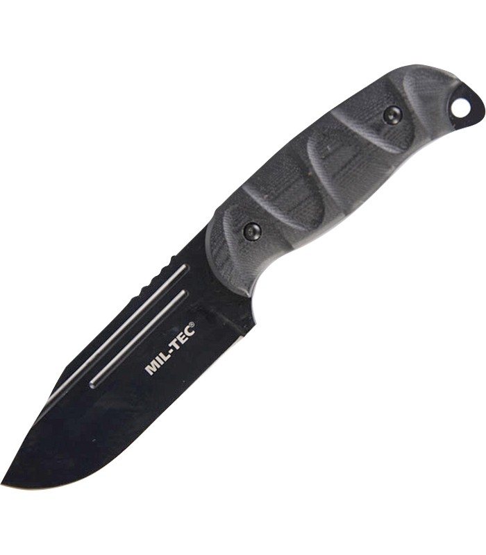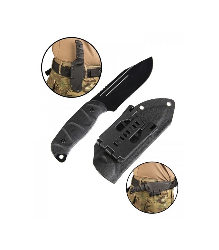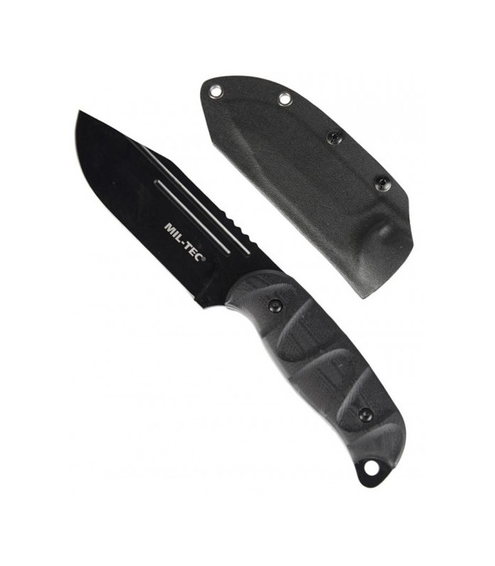 Robuust gevechtsmes van Mil-Tec met breed lemmet, G10 handgreepschalen en Kydex® schede. Het mes ligt met glasvezelversterkte kunststof handgreep en full-tang lemmet met duimsteun stevig in de hand.