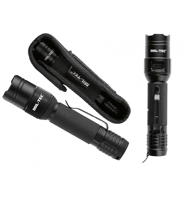 MIL-TEC mini oplaadbare tactische zaklamp met een metalen behuizing en tot 450 lumen in een zeer compact formaat. Het beschikt over IPX7-bescherming, waardoor het bestand is tegen onbedoelde onderdompeling in water tot 1 m gedurende 30 minuten.