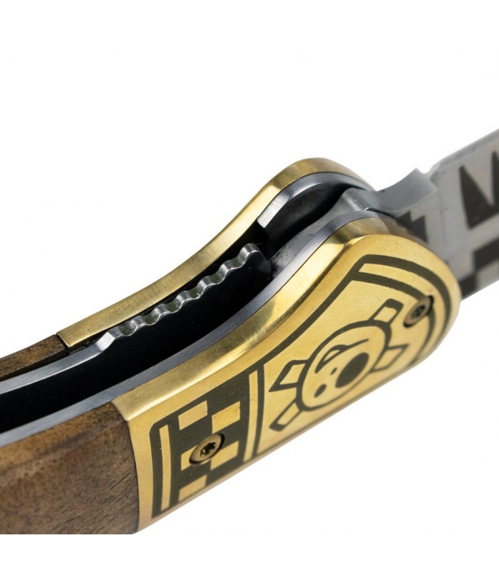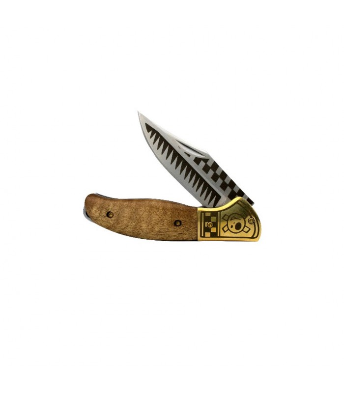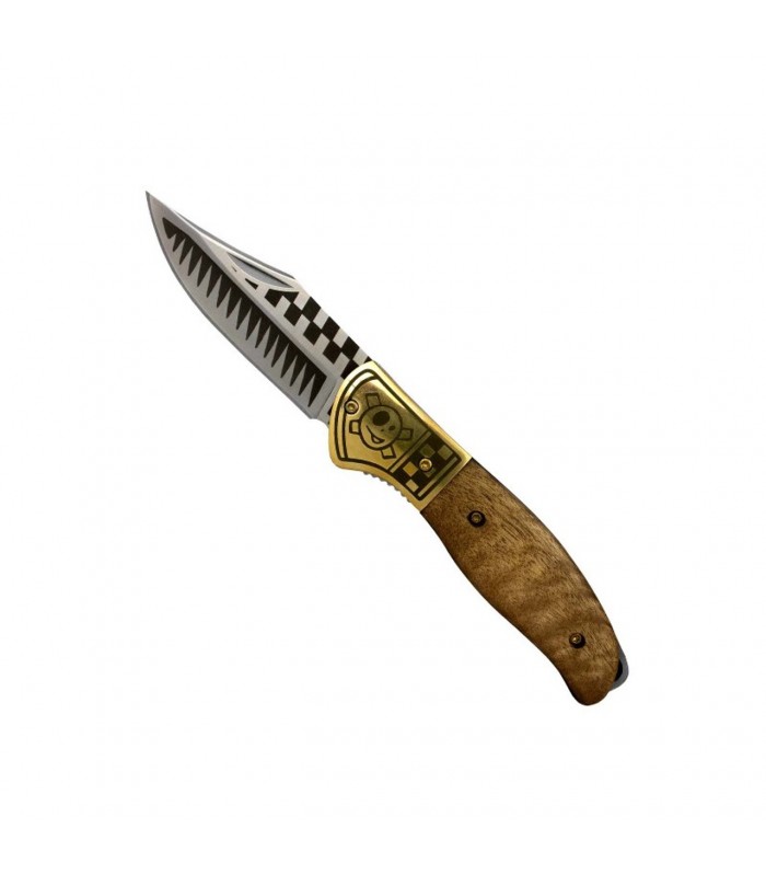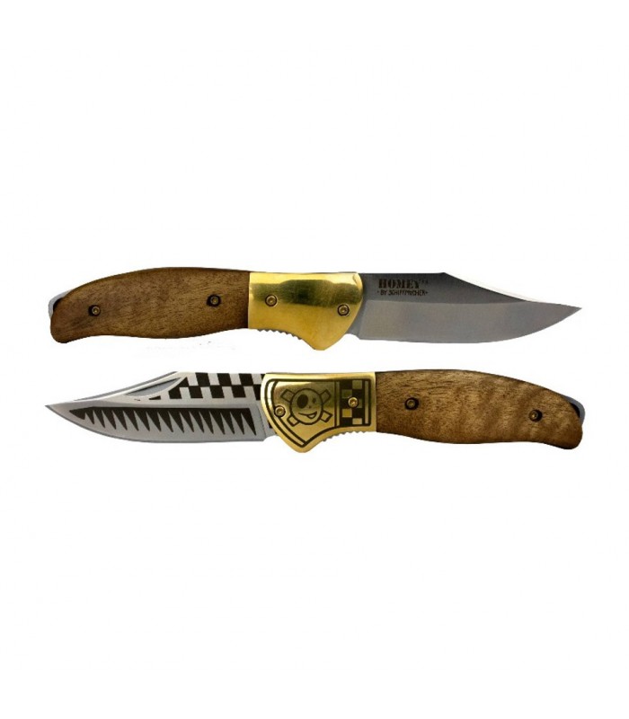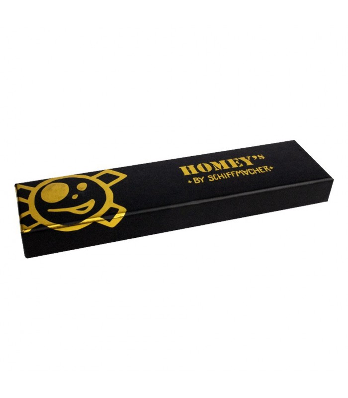 Homey's By Schiffmacher Zakmes. Mede ontwikkeld door Henk Schiffmacher. Hetclip-point lemmet heeft een tatto-opdruk geïnspireerd op het Niho-Mano patroon en een heft met linerlock blokkering, gemaakt van luze wortelnotenhout. Verpakking: Doos.Breedte:23.500 (cm)Hoogte:2.600 (cm)Diepte:6.500 (cm)