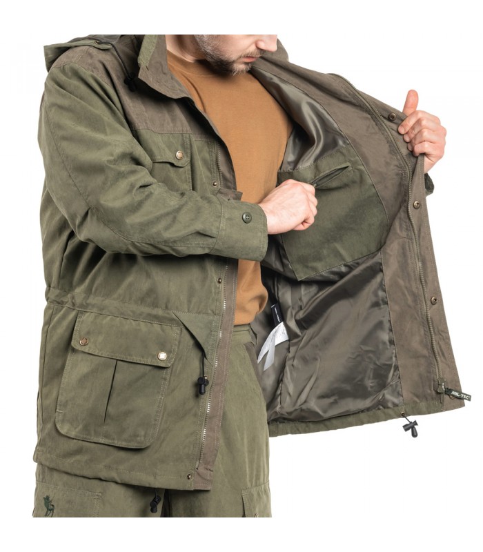 • Laag van stil, duurzaam, • Verborgen rits aan de voorkant • Hoge kraag met geïntegreerde capuchon • Mouwen met klittenbandmanchetten • 6 vakken (zak en één telefoon zak gesloten met rits